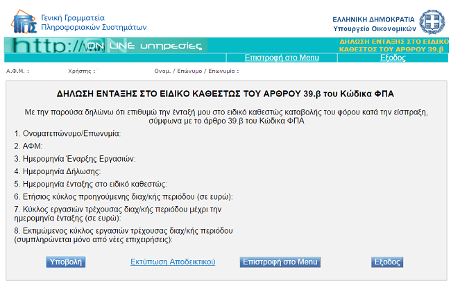 Σε λειτουργία από τη Γενική Γραμματεία Πληροφοριακών Συστημάτων η εφαρμογή "Δήλωση Ένταξης στο Ειδικό Καθεστώς του Άρθρου 39β του Κώδικα Φ.Π.Α".