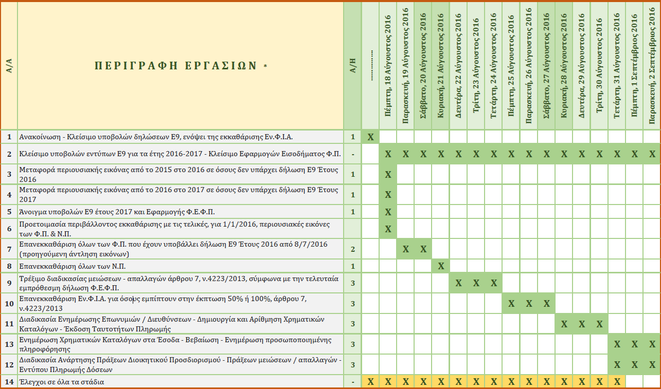 Όπως προκύπτει από τον πίνακα, από τις 18 Αυγούστου έχει ολοκληρωθεί η εκκαθάριση του φόρου ενώ από την προσεχή Δευτέρα 29 Αυγούστου, ξεκινά η έκδοση ταυτοτήτων πληρωμής για τον ΕΝΦΙΑ.
