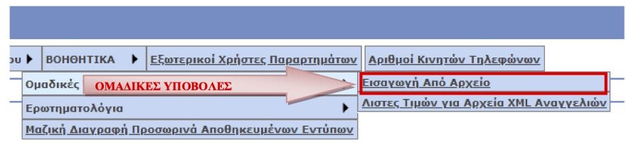 Για την καταχώρηση των στοιχείων του αρχείου *.xml στο «ΕΡΓΑΝΗ» πρέπει να επιλέξετε τα μενού [ΒΟΗΘΗΤΙΚΑ] >> [Ομαδικές υποβολές] >> [Εισαγωγή από αρχείο].