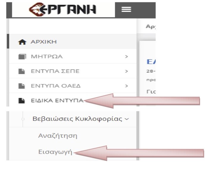 - Επιλογή: ΕΙΔΙΚΑ ΕΝΤΥΠΑ -> Βεβαιώσεις Κυκλοφορίας -> Εισαγωγή