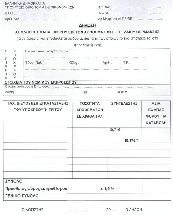 Δήλωση απόδοσης εφάπαξ φόρου επί των αποθεμάτων πετρελαίου θέρμανσης