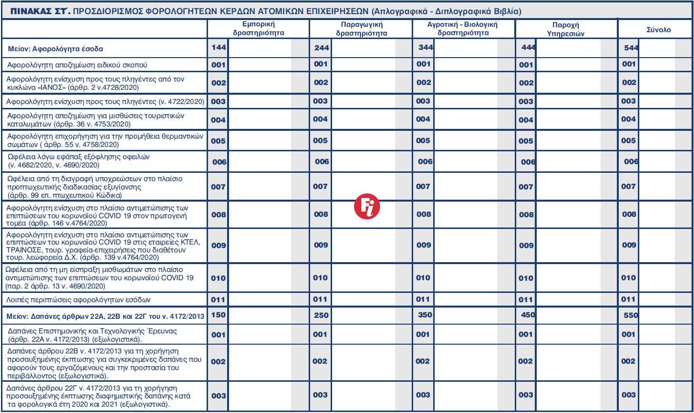 - για τους κωδικούς των αφορολογήτων εσόδων (κωδ. 144, 244, 344, 444, 544) τα οποία αφαιρούνται για τον υπολογισμό του φορολογητέου καθαρού αποτελέσματος. Ο υποπίνακας που απαιτείται να συμπληρωθεί περιλαμβάνει αναλυτικά πεδία για πλήθος αφορολογήτων εσόδων που θεσπίστηκαν με διατάξεις νόμων εντός του 2020