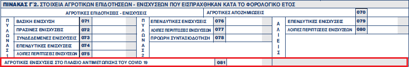 Επίσης, στον Πίνακα Γ2 "Στοιχεία Αγροτικών Επιδοτήσεων - Ενισχύσεων που εισπράχθηκαν κατά το φορολογικό έτος" προστέθηκε νέος κωδικός για τις αγροτικές ενισχύσεις στο πλαίσιο αντιμετώπισης του COVID-19.