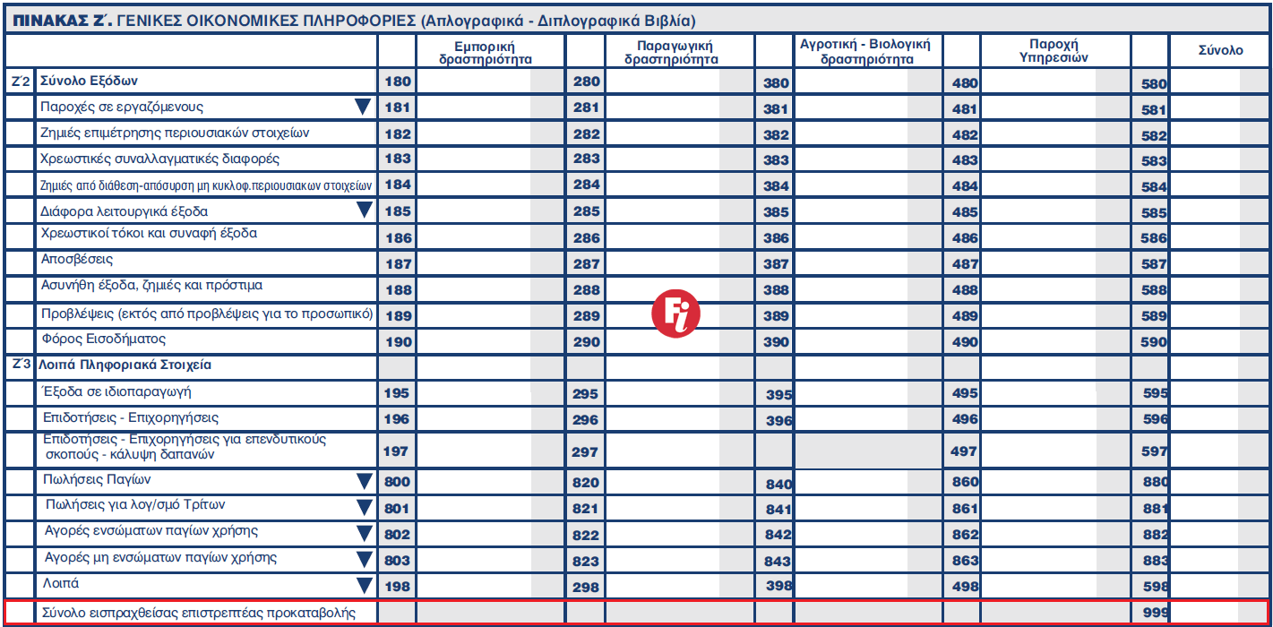 Στον Πίνακα Ζ' "Γενικές Οικονομικές Πληροφορίες (Απλογραφικά - Διπλογραφικά βιβλία) προστέθηκε ο κωδ. 999 όπου αναγράφεται το σύνολο της εισπραχθείσας επιστρεπτέας προκαταβολής.