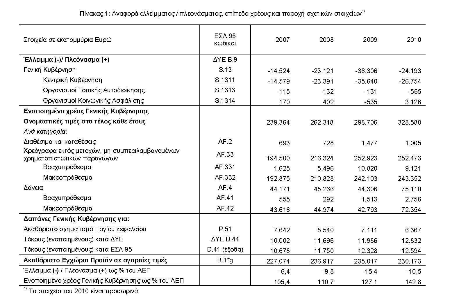 Σύμφωνα με προσωρινά στοιχεία από τις πηγές, το έλλειμμα της Γενικής Κυβέρνησης για το έτος 2010, όπως υπολογίζεται στα πλαίσια της ΔΥΕ, εκτιμάται στα 24,2 δις. Ευρώ (10,5% επί του Ακαθάριστου Εγχώριου Προϊόντος), ενώ το ενοποιημένο χρέος της Γενικής Κυβέρνησης, στο τέλος του 2010 ανήλθε στα 328,6 δις. Ευρώ, (142,8% επί του Ακαθάριστου Εγχώριου Προϊόντος).