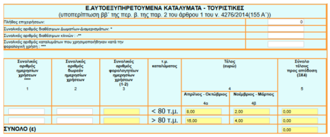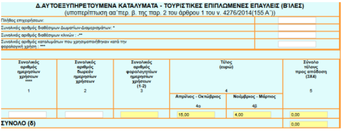 Η τέταρτη κατηγορία ακινήτων αφορά αυτοεξυπηρετούμενα καταλύματα και τουριστικές επιπλωμένες επαύλεις (βίλες), για τα οποία υπόχρεοι υποβολής δήλωσης είναι οι επιτηδευματίες καθώς και τα φυσικά πρόσωπα που διαθέτουν τα ακίνητά τους μέσω βραχυχρόνιας μίσθωσης.