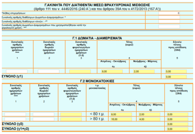 γ) τα ακίνητα που διατίθενται μέσω βραχυχρόνιας μίσθωσης του άρθρου 111 του ν. 4446/2016 (Α’ 240) και του άρθρου 39Α του Κώδικα Φορολογίας Εισοδήματος (ν. 4172/2013, Α’ 167),