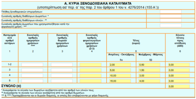 Ιδιαίτερα, για περιόδους διαμονής που εκτείνονται σε μήνες κατά τους οποίους ισχύουν διαφορετικά ποσά τέλους, το εν λόγω ειδικό στοιχείο– απόδειξη εκδίδεται για κάθε μήνα ξεχωριστά και όχι κατά την αναχώρηση του διαμένοντος.