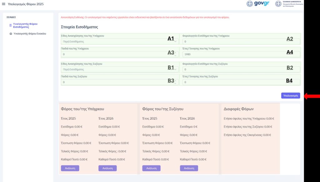 Κάθε πολίτης μπορεί να επιλέξει τον Υπολογιστή Φόρου Εισοδήματος που εμφανίζεται στην αρχική οθόνη ή τον Υπολογιστή Φόρου Ενοικίου.