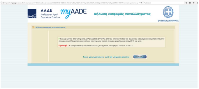 Η υποβολή της δήλωσης εισφοράς συναλλάγματος, αρχική και τροποποιητική, εμπρόθεσμη ή εκπρόθεσμη, για τα φορολογικά έτη 2019 και επόμενα, γίνεται υποχρεωτικά με τη χρήση ηλεκτρονικής μεθόδου επικοινωνίας, μέσω διαδικτύου, στο πληροφοριακό σύστημα TAXISnet.