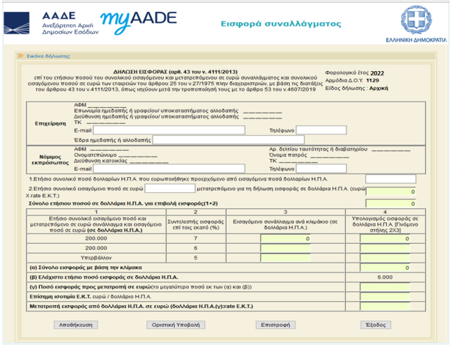 Δήλωση εισφοράς συναλλάγματος του άρθρου 43 ν.4111/13 (όπως ισχύει μετά την αντικατάστασή του με το άρθρο 53 του ν.4607/2019) (Τελευταία ενημέρωση: 21/01/2026)