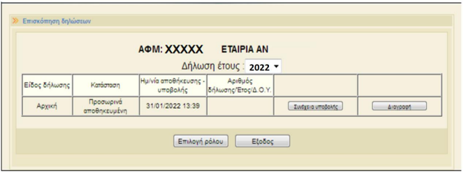 Σε οποιοδήποτε στάδιο συμπλήρωσης της δήλωσης, ο χρήστης μπορεί να προβεί σε «Αποθήκευση» και να συνεχίσει τη συμπλήρωση αυτής σε μεταγενέστερο χρόνο, επιλέγοντας «Συνέχεια υποβολής».