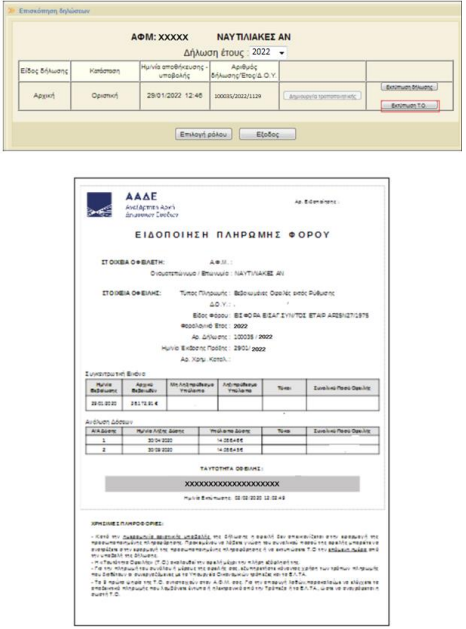 Αφού οριστικοποιηθεί η δήλωση, ο χρήστης εκτυπώνει την «Ταυτότητα Οφειλής» (Τ.Ο.) ως εξής: