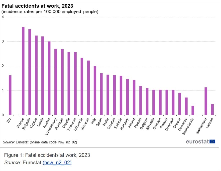 Η χώρα μας, σύμφωνα και με τα επίσημα στοιχεία της Eurostat, παρουσιάζει μια πολύ καλή εικόνα συγκριτικά με τα υπόλοιπα κράτη μέλη της Ένωσης. Σύμφωνα με τα τελευταία στοιχεία που εξέδωσε η Eurostat τον Οκτώβριο του 2025, για τα εργατικά δυστυχήματα μεταξύ των χωρών της ΕΕ, η Ελλάδα βρίσκεται μεταξύ των τριών χωρών όπου παρατηρούνται τα λιγότερα θανατηφόρα εργατικά ατυχήματα, πίσω μόνο από τη Γερμανία και την Ολλανδία. Και παρά το γεγονός ότι τα τελευταία χρόνια και το εργατικό δυναμικό έχει αυξηθεί κατά 509.000 εργαζομένους και η παραγωγική δραστηριότητα έχει αυξηθεί.