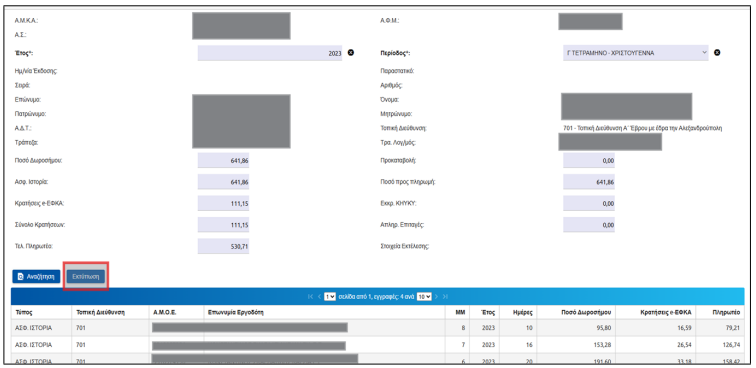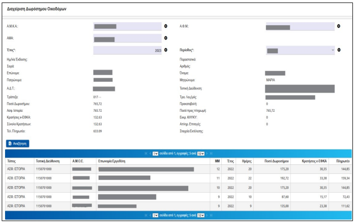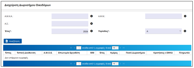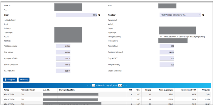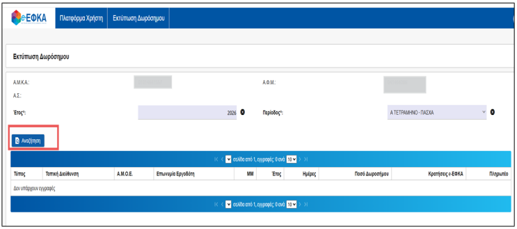 Με την είσοδο του χρήστη εμφανίζονται συμπληρωμένα τα πεδία ΑΜΚΑ και ΑΦΜ. Επίσης, εμφανίζονται προσυμπληρωμένα τα πεδία «Έτος» και «Περίοδος», ώστε να αντιστοιχούν στο/ην τρέχον/τρέχουσα έτος και περίοδο. Ωστόσο, ο χρήστης έχει τη δυνατότητα τροποποίησής τους για την αναζήτηση παρελθοντικών εγγραφών.