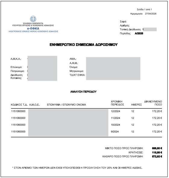 Στον πίνακα ανάλυσης εμφανίζεται διακριτή εγγραφή για κάθε μήνα, όπως έχει προκύψει από την ασφαλιστική ιστορία με το σύνολο των ημερών του μήνα, το ποσό Δωροσήμου που αντιστοιχεί στο μήνα, οι κρατήσεις e-ΕΦΚΑ που αντιστοιχούν στο μήνα και το πληρωτέο ποσό.