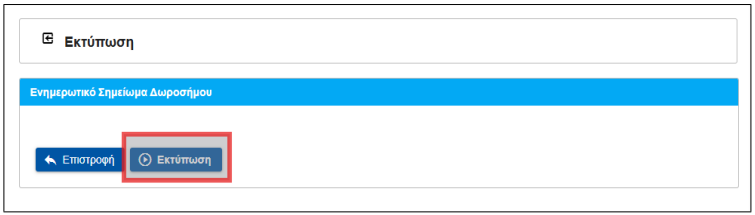 Για την εκτύπωση του Ενημερωτικού Σημειώματος Δωροσήμου, ο χρήστης επιλέγει το διακριτό κουμπί «Εκτύπωση»