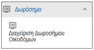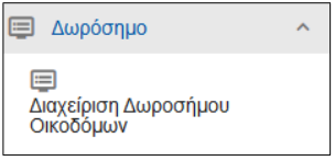 Στην παρακάτω οθόνη από το μενού αριστερά, επιλογή «Δωρόσημο» και στη συνέχεια «Διαχείριση Δωροσήμου Οικοδόμων»: