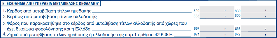 Στον υποπίνακα Ε δηλώνεται το εισόδημα που προκύπτει από μεταβιβάσεις τίτλων του άρθρου 42 του Κ.Φ.Ε., όπως μετοχές, μερίδια, μερίδες, ομόλογα, παράγωγα, κ.λπ., που πραγματοποιούνται από επαχθή αιτία.
