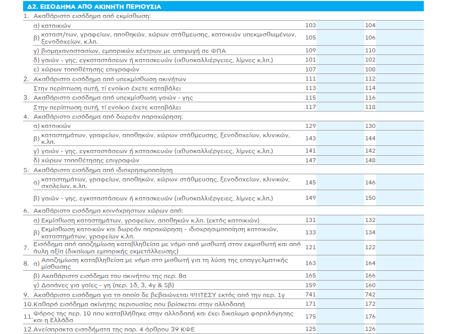 Από τα συνολικά ποσά των στηλών του εντύπου Ε2 μεταφέρονται τα επιμέρους ποσά κατά κατηγορία γης ή ακινήτου στους αντίστοιχους κωδικούς του υποπίνακα 4Δ2, εκτός από το εισόδημα από δωρεάν παραχώρηση της χρήσης μίας κύριας κατοικίας προς ανιόντες ή κατιόντες εξ αίματος και εξ αγχιστείας, επιφάνειας μέχρι διακόσια (200) τετραγωνικά μέτρα.