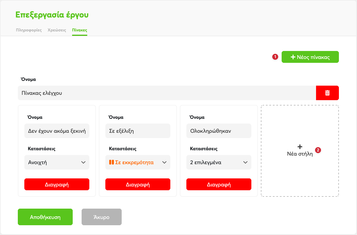 Οι καταστάσεις της στήλης ειναι αυτό με το οποίο διαχωρίζονται οι εργασίες ανα στήλη και μπορείτε να διαλέξετε περισσότες από μια καταστάσεις ανά στήλη. Όταν μια εργασία έχει πλέον αυτή την κατάσταση, θα εμφανίζεται στη στήλη αυτή στο έργο σας.