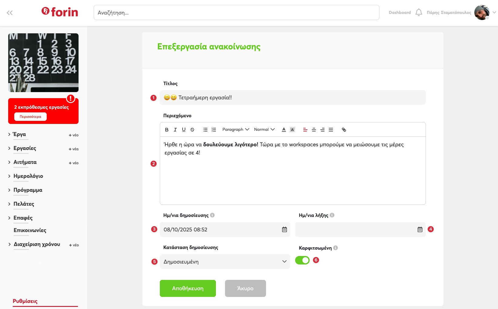 Έχετε τη δυνατότητα ορίζοντας μια ημερομηνία δημοσίευσης στο μέλλον να προγραμματίσετε την ανακοίνωση σας ώστε αυτή να εμφανιστεί μετά την ημερομηνία αυτή.