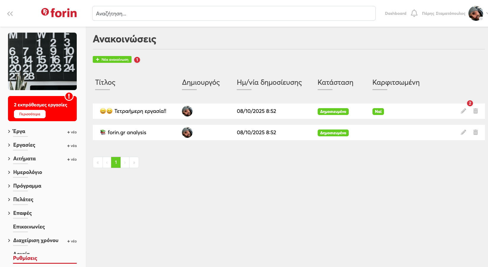 Από τη σελίδα εδώ μπορείτε να προσθέσετε μια νέα ανακοίνωση (1) ή να επεξεργαστείτε / διαγράψετε (2) υπάρχουσες ανακοινώσεις.