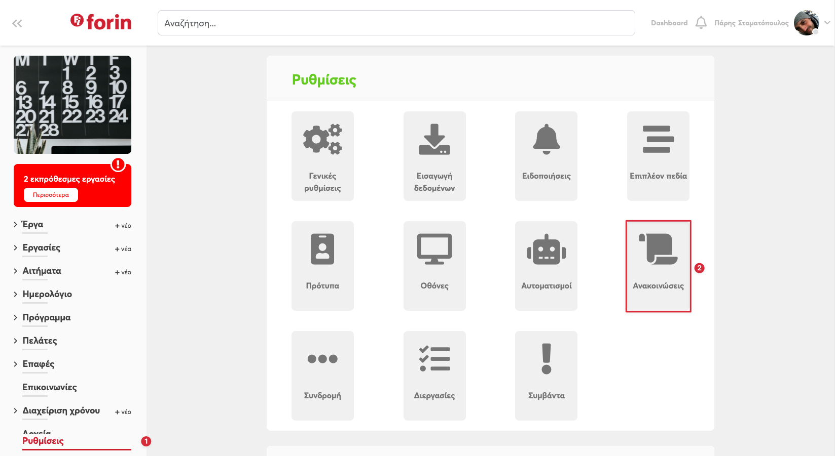 Πηγαίνετε στις Ρυθμίσεις (1) και στη συνέχεια επιλέξτε τις Ανακοινώσεις (2)
