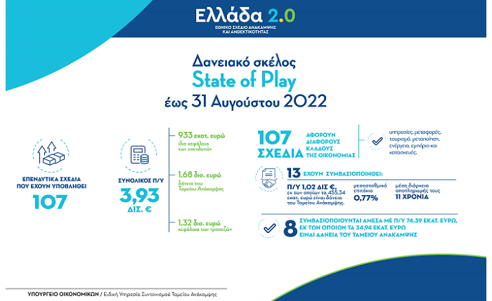 Σε 3,93 δισ. ευρώ ανέρχεται ο συνολικός προϋπολογισμός των επενδυτικών σχεδίων που έχουν υποβληθεί, μέχρι στιγμής, στο δανειακό σκέλος του Εθνικού Σχεδίου Ανάκαμψης και Ανθεκτικότητας.