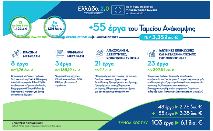 Σε 3,35 δισ. ευρώ ανέρχεται ο προϋπολογισμός των 55 έργων, τα οποία εντάσσονται στο Ταμείο Ανάκαμψης και Ανθεκτικότητας, μετά από έγκριση του αρμόδιου για το Πρόγραμμα Αναπληρωτή Υπουργού Οικονομικών.