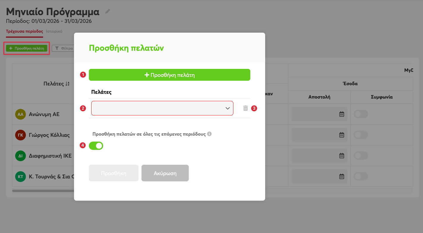 Αν ενεργοποιήσετε την "Προσθήκη πελατών σε όλες τις επόμενες περιόδους" (4) οι πελάτες που έχετε διαλέξει θα μπούν στους κανόνες του προγράμματος και θα δημιουργηθούν και σε επόμενες περιόδους.