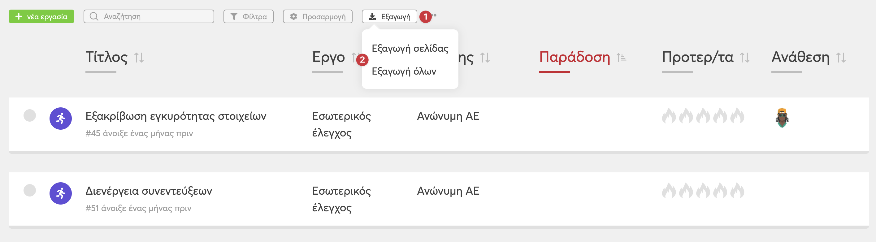 Ναι φυσικά και μπορείτε. Σε όλες τις λίστες εργασιών μπορείτε να πατήσετε στο κουμπί Εξαγωγή (1) και στη συνέχεια να επιλέξετε αν θέλετε να Εξάγετε μόνο τη συγκεκριμένη σελίδα ή όλες τις Εργασίες από το popup που θα εμφανιστεί (2)